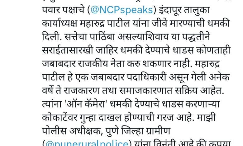 - दोन दिवसापासून इंदापूर तालुक्यामध्ये दोन्ही राष्ट्रवादींमध्ये वाकयुद्ध सुरू आहे. त्यातच आज बारामती लोकसभा मतदारसंघाच्या खासदार सुप्रिया सुळे यांनी ट्विटरच्या माध्यमातून एक पोस्ट करत महारुद्र पाटील यांना मारहाण करण्याची धमकी देणाऱ्या राष्ट्रवादी काँग्रेस अजित पवार गटाचे तालुका अध्यक्ष हनुमंत कोकाटे यांच्यावरती कारवाई करण्यात यावी अशी मागणी पुणे ग्रामीणचे पोलीस अधीक्षक यांच्याकडे केली आहे.